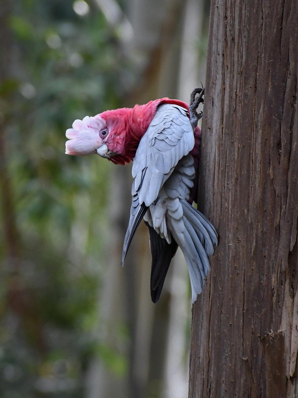 Australian Galah at Warrawong Wildlife Sanctuary, June 2023. Nikon D7500 The Galah or pink and grey cockatoo is widespread throughout Australia. This one was busy getting at something under the bark of the tree.